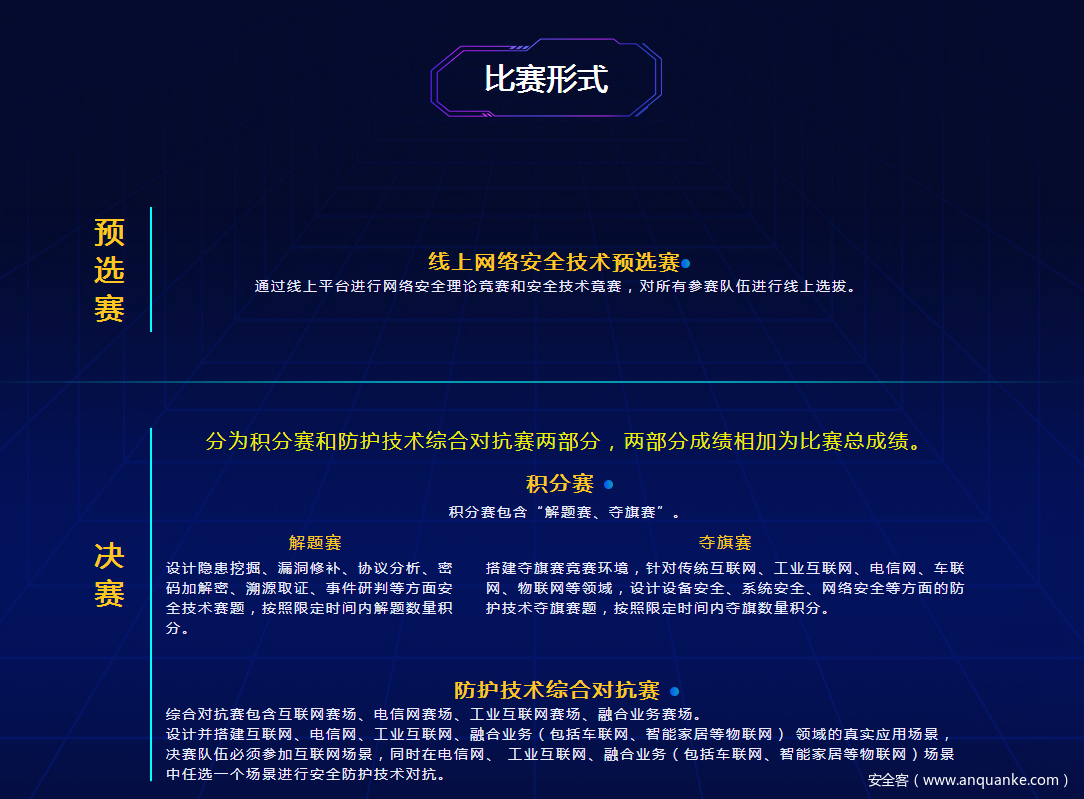 大赛围绕电信和互联网、工业互联网、融合业务安全,设置网络安全技术、法律政策等方面理论赛题和隐患挖掘、漏洞修补、协议分析、密码加解密等方面技术赛题,并针对重点业务应用和系统平台等安全,设计并搭建典型网络安全防护技术对抗场景。