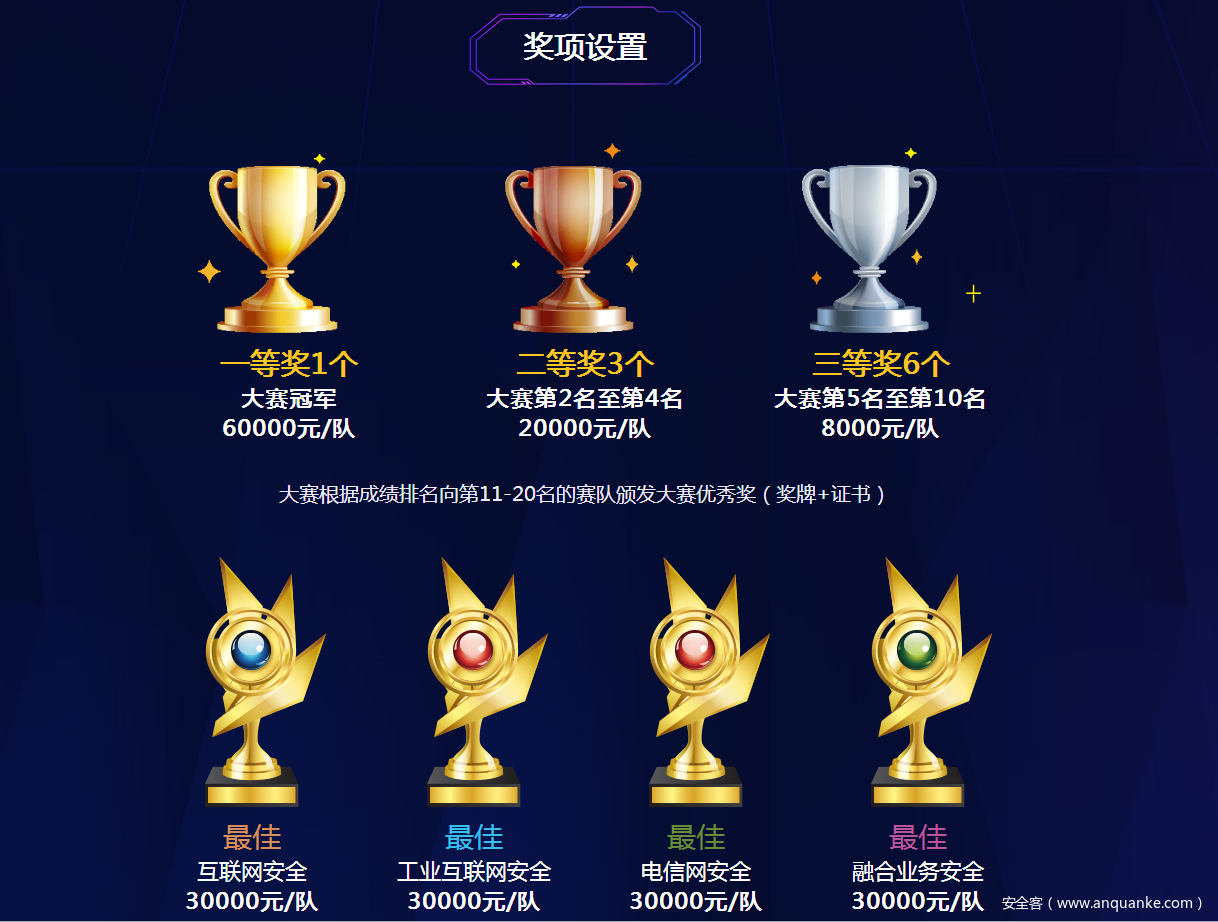 现场决赛:线上预选赛排名前60的战队可申请参加决赛,赛队人员应由同一企业、高校、事业单位人员组成, 于10月19日前向赛事组委会提交加盖单位公章的报名表和个人身份证明,经组委会审核通过后,按照预赛排名取40支战队参赛。