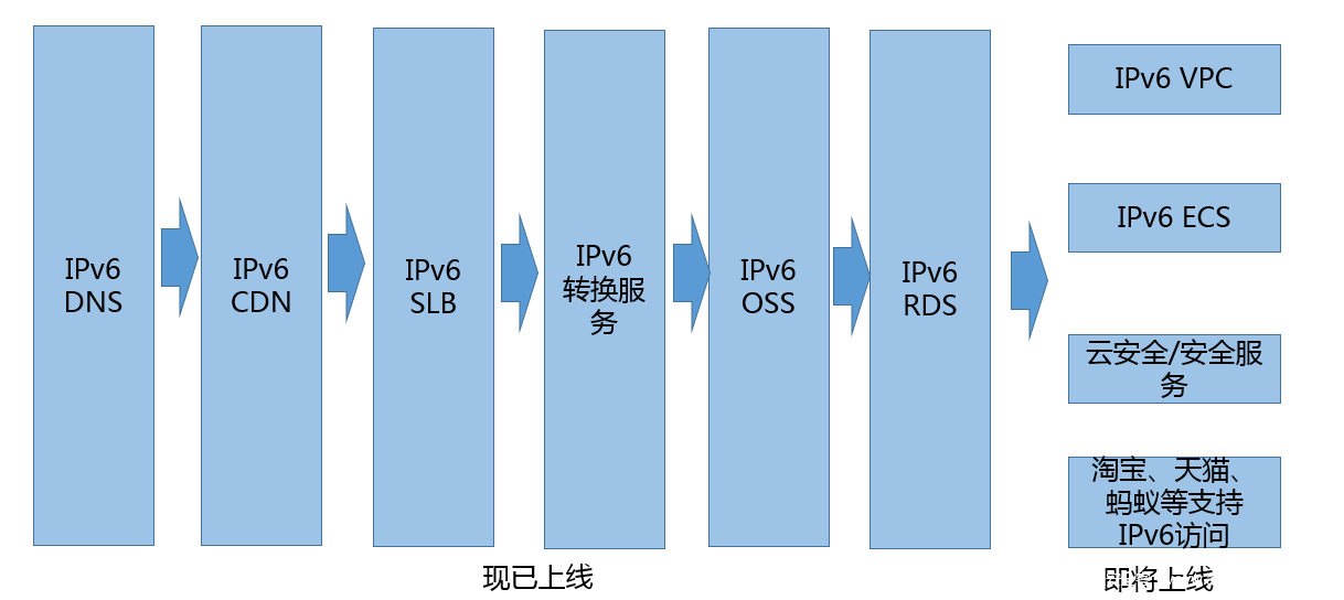 截止目前阿里云现已上线发布SLB、IPv6转换服务、云解析DNS、CDN、OSS、RDS六款产品,按照国家IPv6行动计划和统筹安排,阿里巴巴正在大力推进IPv6改造升级,2018年底前TOP50互联网企业应用(淘宝、天猫等)改造完成,可具备IPv6访问能力,同时阿里云产品会为客户提供端到端的IPv6解决方案,完成IPv4和IPv6双栈改造,50%云产品支持IPv6,包括VPC,ECS等。
