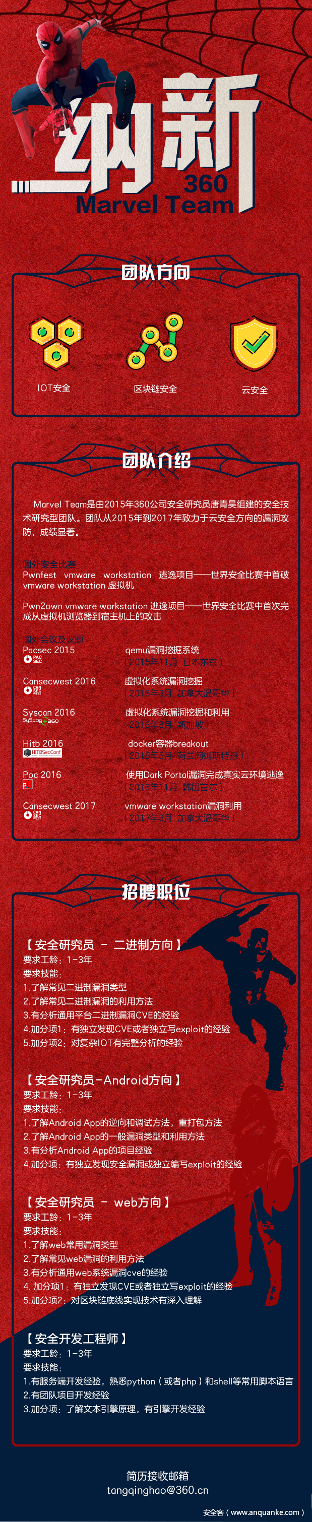 Marvel Team是360公司安全研究员唐青昊在2015年成立的安全团队,致力于在互联网前沿业务领域开展信息安全技术研究。在2015至2017的时间中致力于云安全方向的虚拟化系统漏洞挖掘,发现数十枚高危安全漏洞,受邀在5个国际安全会议中进行演讲,并最终完成有安全奥运会之称的PWN2OWN比赛项目。在2018年开始在IOT领域的新征程。
