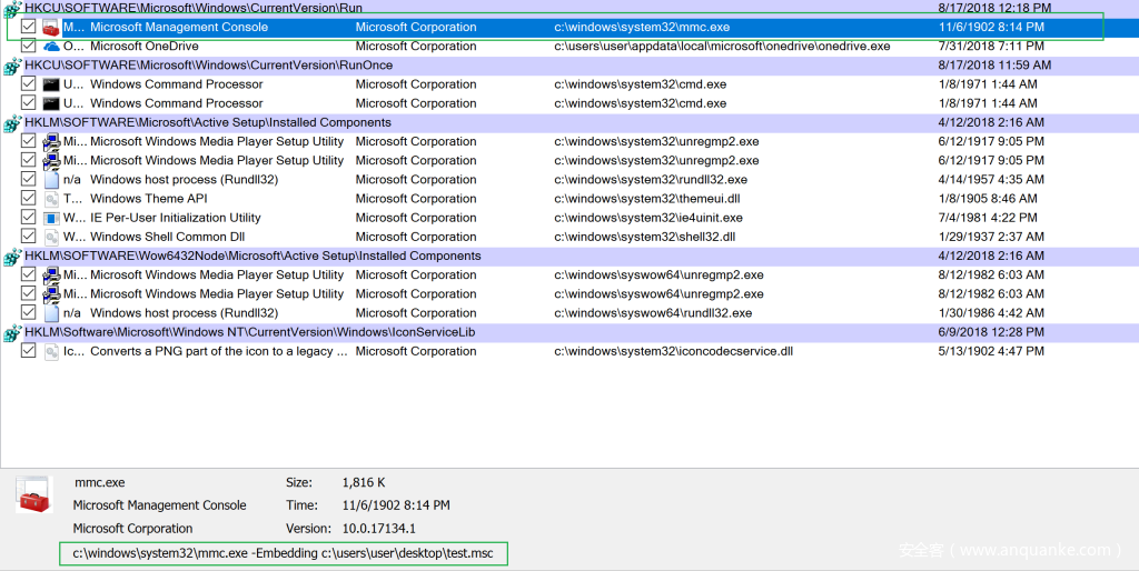 在利用AutoRuns实现本地持久化方面,由于mmc.exe是经过微软签名的二进制程序,因此可以规避默认的过滤器,如下图所示: