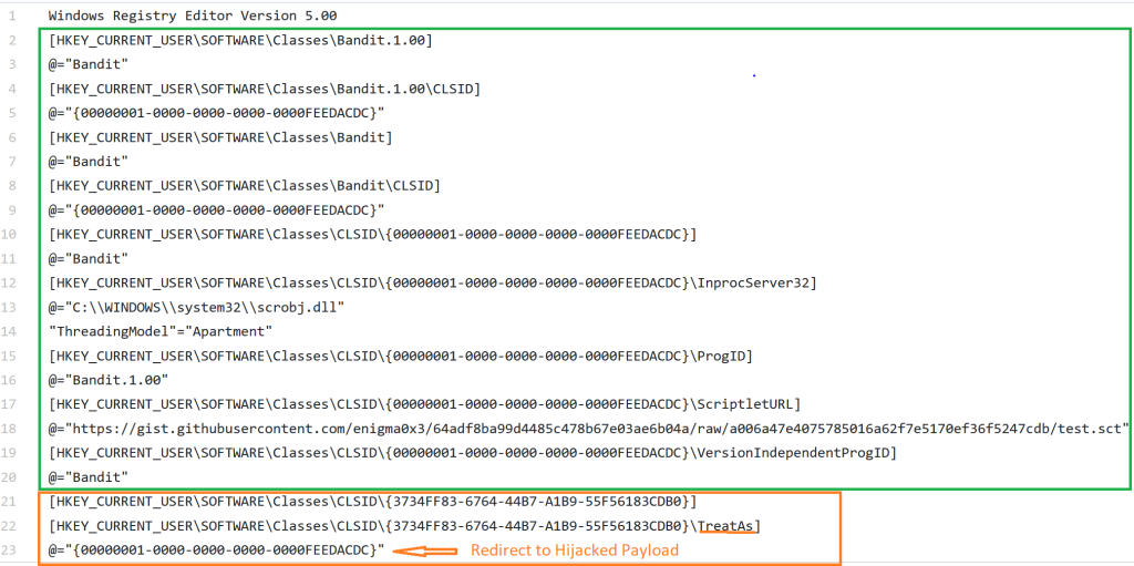 [调用方] -> [第一个CLSID入口点] -> [TreatAs键应用] -> [第二个CLSID入口点] -> [COM服务器] -> [载荷(比如Scrobj.dll Scriptlet)]