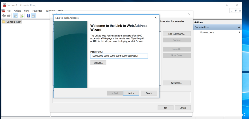 首先,我们需要创建一个CLSID链接,将我们的配置信息保存成控制台文件(.msc文件)。我们可以打开MMC,通过“Add/Remove Snap-In”窗口来设置载荷。为了简单起见,我们选择“the Link to Web Address”(指向Web地址的链接)这个snap-in来打开向导,在“Path or URL”文本框中输入被劫持的/引用的CLSID键,如下图所示: