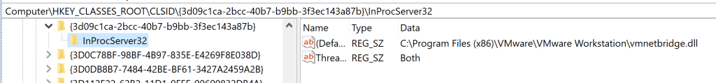 InprocServer32以及LocalServer32(此外还包括InprocServer和LocalServer)的键值(key-values)是COM服务器(即DLL、CPL、EXE以及OCX程序)的引用点。当攻击者发现(存在漏洞的)一个引用点后,就可以在适当条件下(比如路径可写时)将载荷投放到已被遗弃的PE(Portable Executable)引用路径上。如果被调用时(比如加载器或者程序引用了COM键时),由于调用方会尝试实例化CLSID入口点下的COM对象,因此PE载荷就会得到加载机会。前一篇文章中我介绍了VMware vmnetbridge.dll这个例子,这里再简单回顾一下。