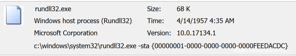 如前一篇文章所述,通过CLSID键(或者PROGID)调用载荷的一种方法就是在rundll32中使用-sta(single threaded apartment)参数,这种方法并没有那么广为人知,具体命令为:
