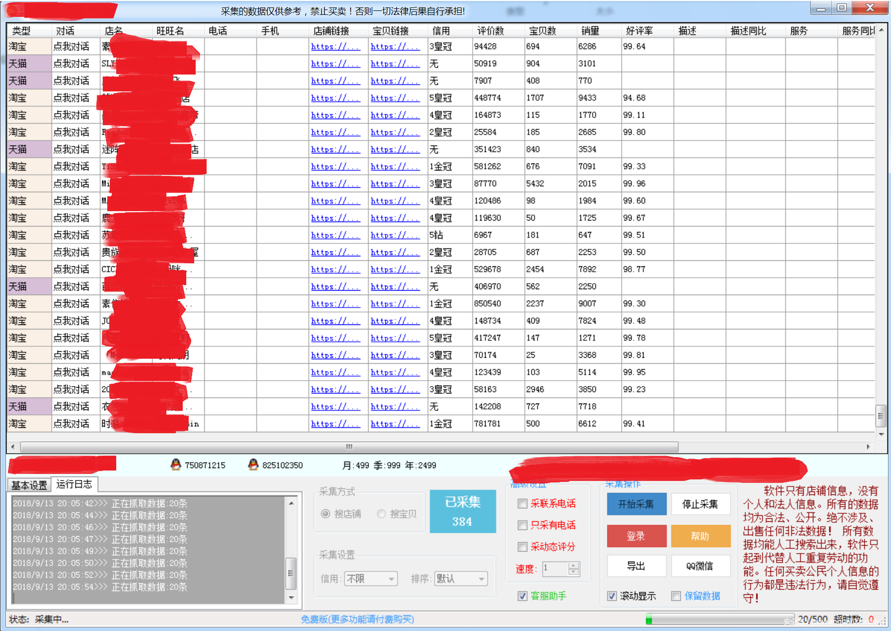 自《中国人民共和国网络安全法》发布并严格执行以来,黑产从业者发生了两个明显的变化:一个是越来越多的人采用匿名通信,匿名交易的方式来隐藏自己;另外一个是明显触发法律的黑产工具,如盗号木马,远控木马,游戏外挂等,做的人越来越少。虽然也有铤而走险者,但更多的人还是会权衡风险和收益,做到最大化的趋利避害。以电商行业为例,虽然有人仍然利用一些木马类工具软件进行资金的盗取和诈骗,但更为活跃的是一些辅助类工具软件,比如商家辅助工具,提供数据采集和分析,店铺引流等功能。有些软件还在界面显著位置放置了免责声明(虽然不一定有用),如下图: