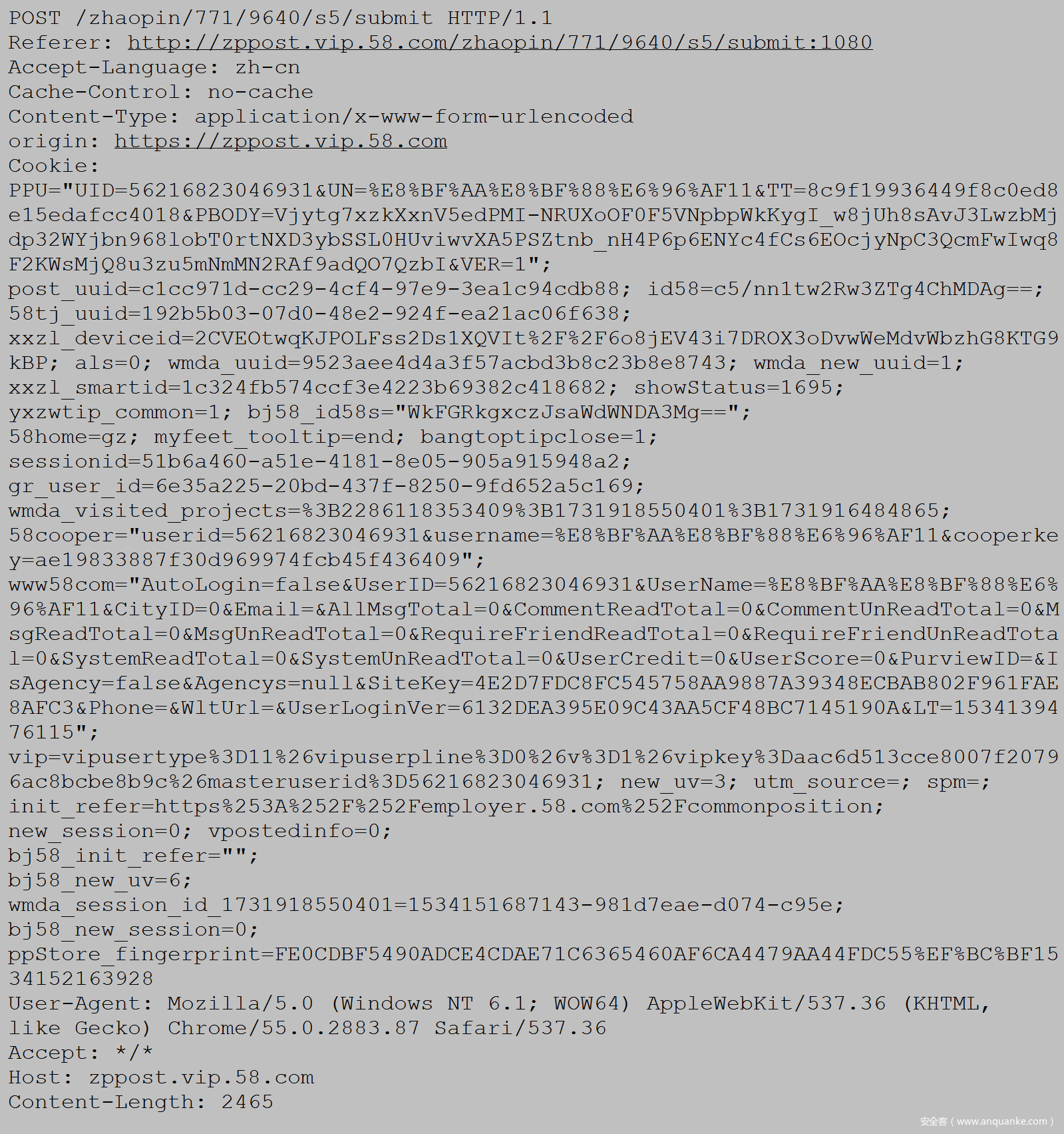 界面上会有很多发帖的相关设置,这些设置是黑灰产人员在分析58发帖的接口之后提取出来的,用户需要操作的一些变量值(包含发帖的省份、城市、街道、帖子标题、帖子职位等接口所需要的一些参数)。如下所示为我们构造的VIP用户发招聘帖捕获到的接口信息:
