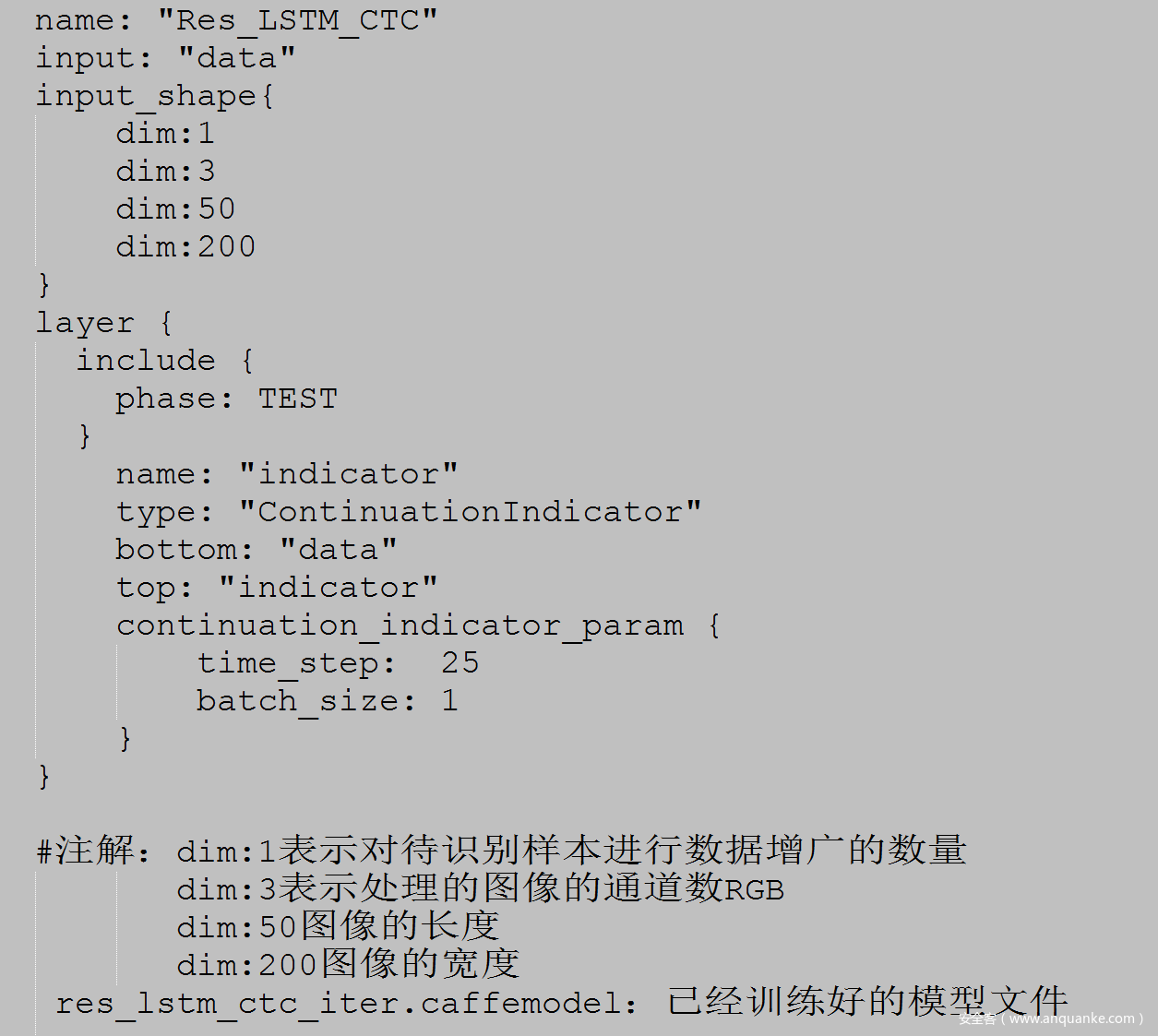 之后该工具会使用内置的深度学习框架Caffe 识别图片验证码。识别验证码的过程会读取本地内置深度学习框架Caffe框架所需要的3个文件:deploy.prototxt,res_lstm_ctc_iter.caffemodel,label-map.txt。其中deploy.prototxt部分代码如下: