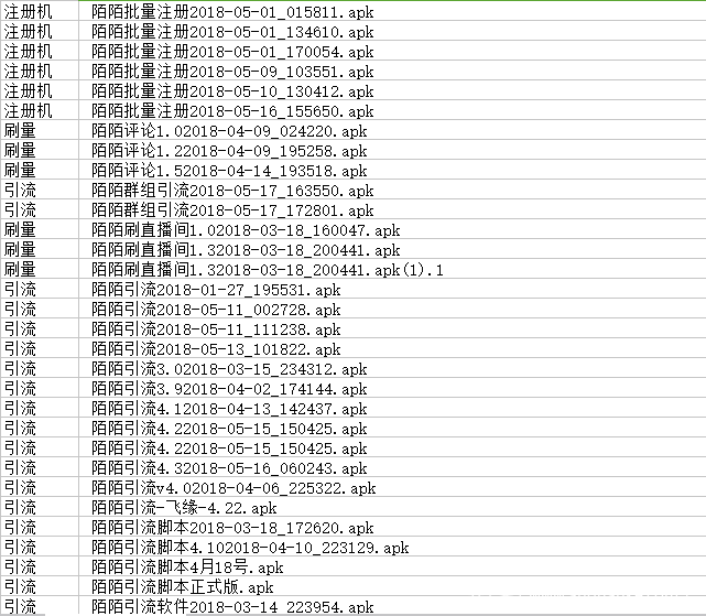 相较于PC端工具软件,移动端工具软件可以通过外挂的方式,实现更低的对抗成本。经过我们分析,捕获的短视频行业黑灰产工具中,就有大量基于按键精灵安卓版和易安卓编写的黑灰产工具,覆盖了注册,刷量,引流等黑灰产核心业务场景,如下图: