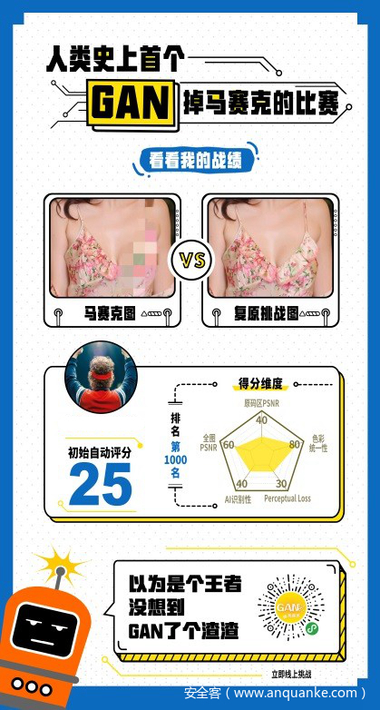 给身份证打个码,给照片打个码,给片子里的人打个码。这些已经成为了人们保护隐私的日常操作,但是,黑客现在要告诉你,仅仅依赖打码就万事皆平安的年代已经过去,现在通过AI技术就可以将已经打码的图片完美还原如初。此次“GAN掉马赛克”趣味挑战赛,通过这些通俗易懂,但充满挑战和技术门槛的趣味赛事,让更多人了解如何以黑客的思维去关注AI发展的安全问题,并对“GAN-生成式对抗网络”技术在AI安全领域的应用进行探索。