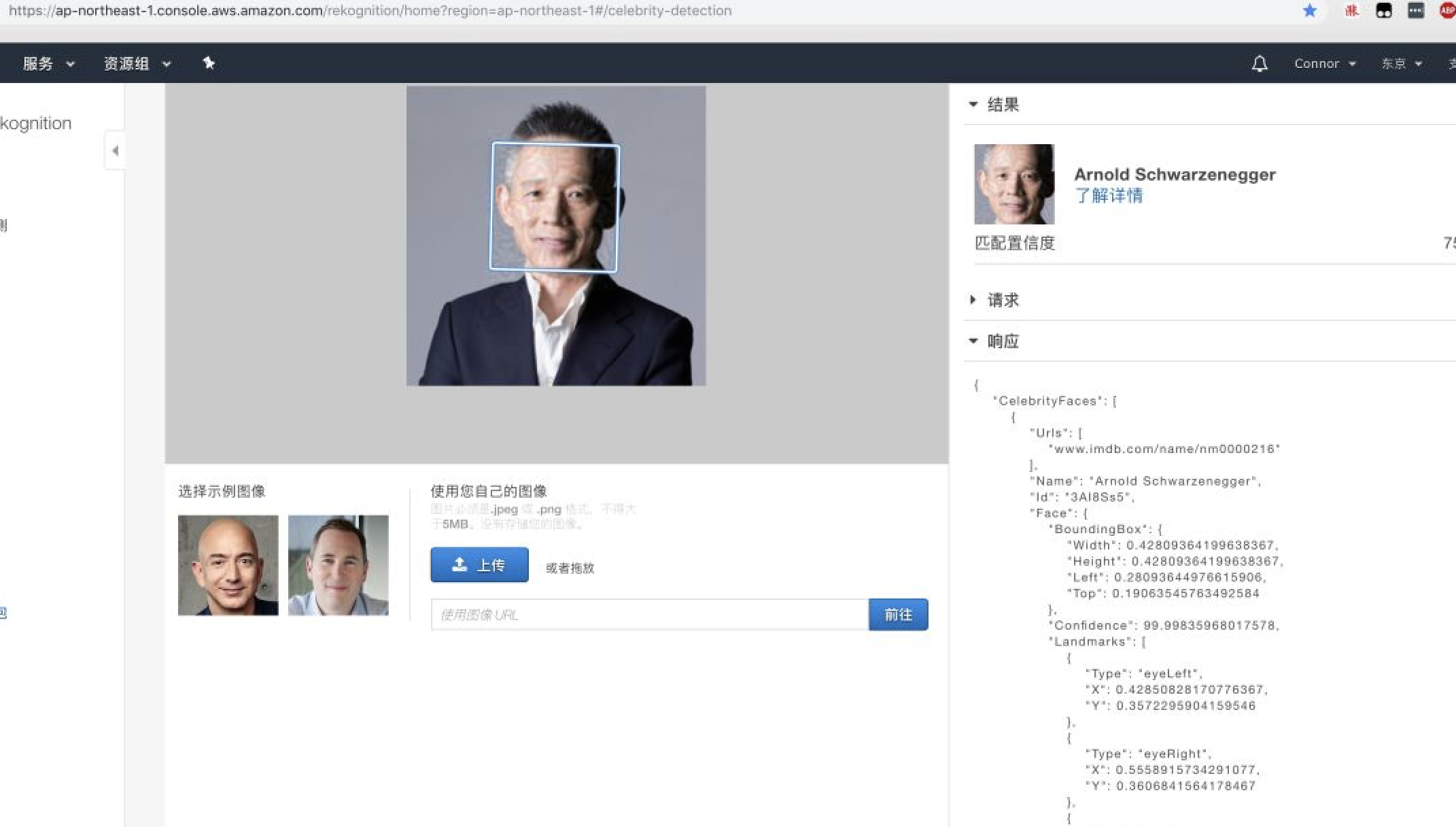 C: 将主持人蒋昌建老师的照片识别为阿诺德·施瓦辛格(难度最高的针对基于实际云平台的亚马逊名人识别系统)