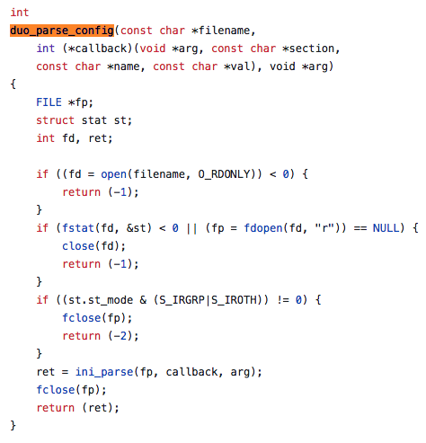 然后调用duo_parse_config检查配置文件的读写权限,当返回值为-2时抛出错误“config文件应仅root可读”,当返回值为-1时抛出文件不可打开错误:
