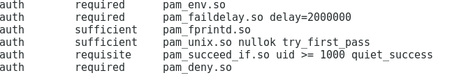 pam_fprintd模块是进行指纹验证,由于控制标志为sufficient,验证失败并不影响继续验证。Pam_unix nullok参数允许空密码,try_first_pass使用先前模块的密码进习惯验证。
