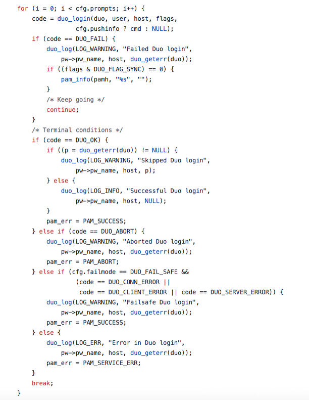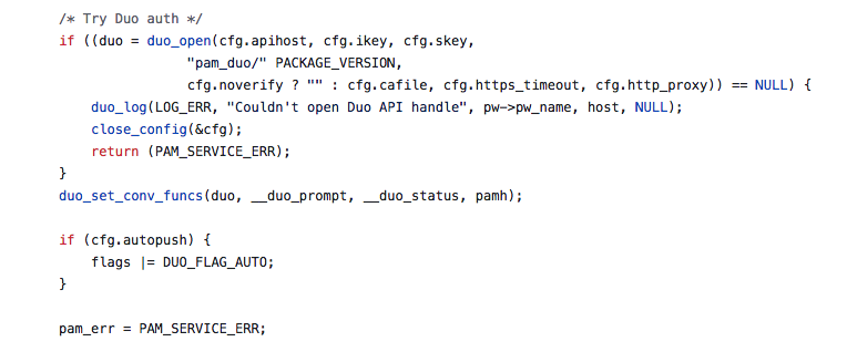 这边开始进行DUO认证过程。使用pam_duo.conf配置的ikey、skey、apihost调用DUO API接口,检测API接口连接,当处理错误返回DUO服务错误: