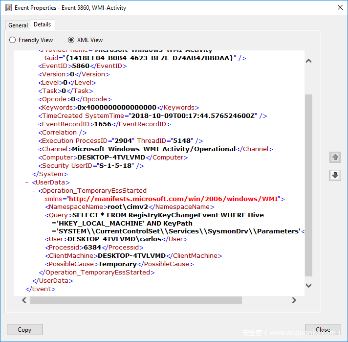 如果我们想跟踪WMI过滤器的使用行为,那么如上操作会在WMI-Activity/Operational中留下日志,事件ID为5860,EventData中的字段表明可能的原因为Temporary,日志中同样包含生成该事件的进程ID值。