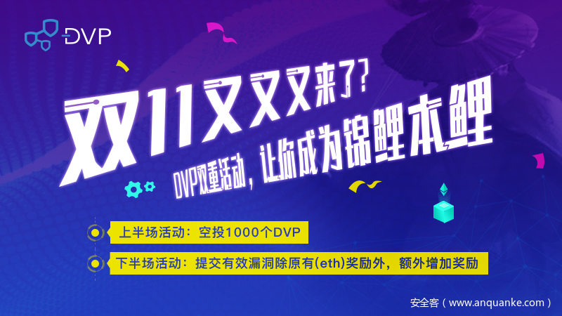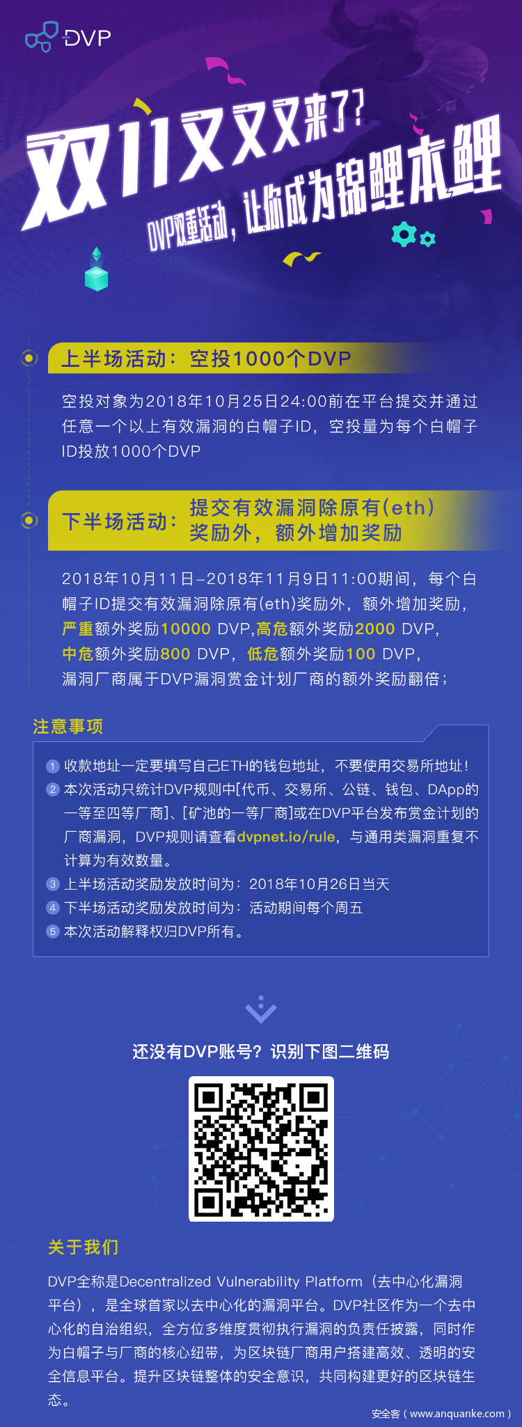 双11又又又来了? DVP双重活动,让你成为锦鲤本鲤,2018年10月25日前提交漏洞参加上半场火力空投,2018年10月11日-2018年11月9日11:00下半场无上限叠加奖励,多提多奖。