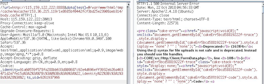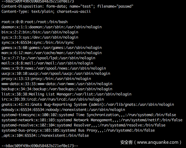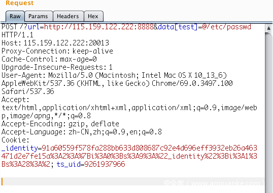 那我们首先来尝试一下,读一下 /etc/passwd 文件,我们只要构造一个post请求,然后将传入的data数组的某个键的值改成 @/etc/passwd 就可以读取文件,本地搭建了一个环境进行测试: