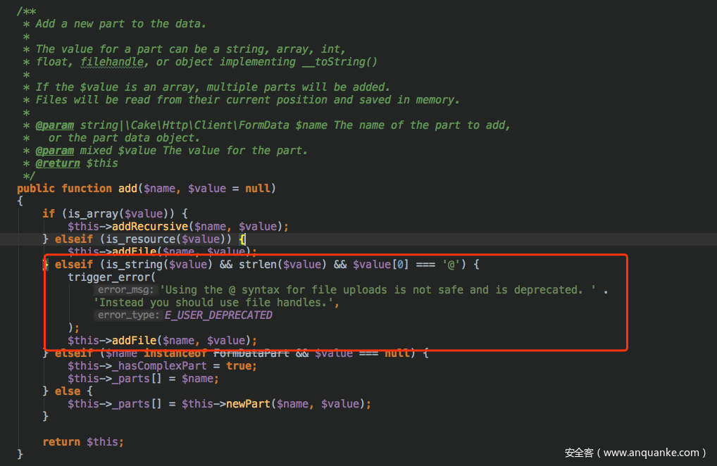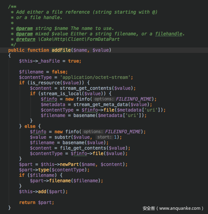 这里判断了一下传入的 $value 是否是以 @ 开头的,如果是,则进入 addFile 函数中: