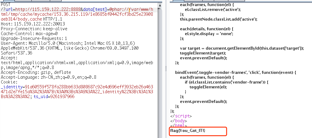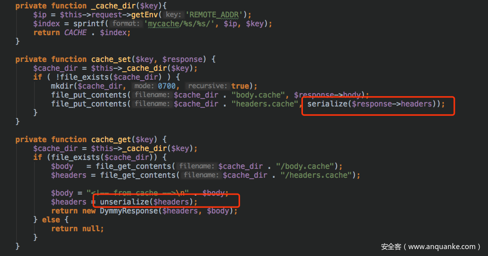 可以看到在缓存机制中,有关headers.cache是采用了序列化的机制,会把请求得到的返回头序列化以后,存储到文件中去,然后在读取缓存的过程中反序列化执行,这里是一个很明显的利用点,估计很多攻击者都会去底层代码中寻找有关这个地方反序列化的利用技巧,我在刚开始的时候也是被困在这里了,直到看到writeup,才恍然大悟,这是一个陷阱。最后的利用思路反而在没有序列化操作的body.cache,不得不说orange大佬出题果然厉害,那我们就来看一下,具体是怎么一步一步实现的反序列化。