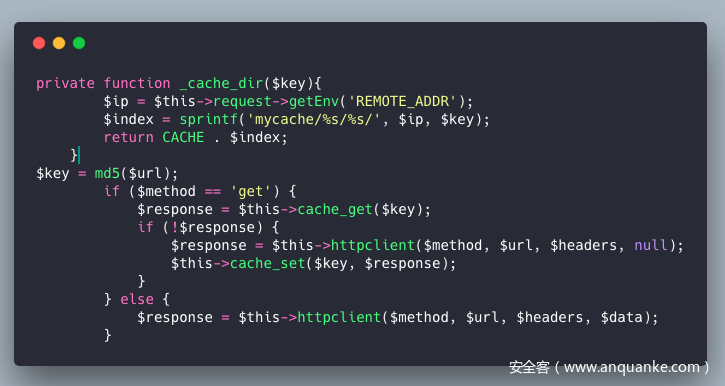 所以缓存路径是可以得到的 /var/www/html/tmp/CLIENTIP/md5(url)/ ,第二个就是缓存的文件名,文件分为两个,一个是body.cache ,另一个是 headers.cache.