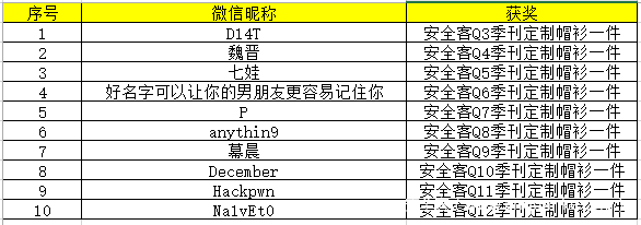 调查问卷一发布,就有大波小伙伴给了我们反馈,今天我们在安全客微信公众号后台抽取了发送序号为1、4、8、12、16、20、24、28、32、36的小盆友,每人赠送一件安全客Q3季刊定制帽衫,请以下获得奖品的小伙伴加安全客官方QQ群:702511263,在11月2日下午5点之前将寄送地址及发送截图以及你的帽衫尺码直接私信管理员@只顾,或者邮件发送至i-wangcaiyun@360.cn