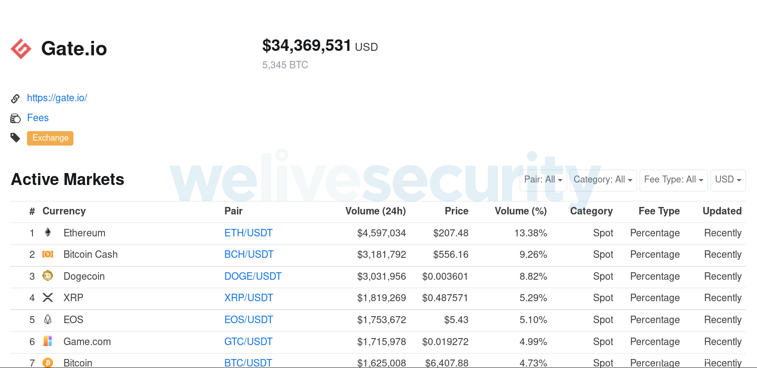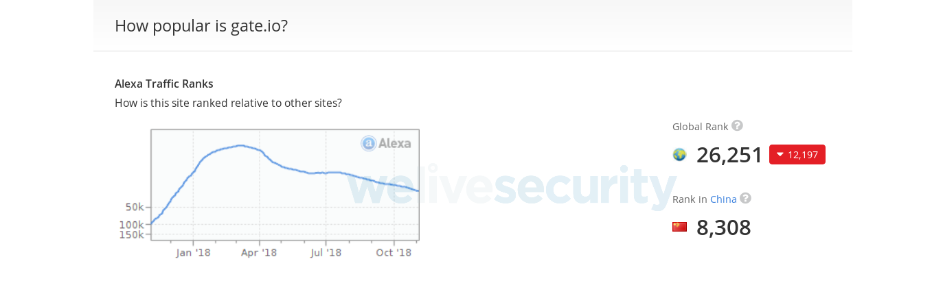 如前文所述,攻击脚本以特定的URI(Uniform Resource Identifier)为目标:myaccount/withdraw/BTC。 事实证明,在本文撰写时,互联网的各种密货交换服务中只有gate.io页面具备这种URI特征。 因此,这个交换所似乎是这次袭击的主要目标。 该交易所非常受人们欢迎,其Alexa排名26,251,在中国排名8,308。