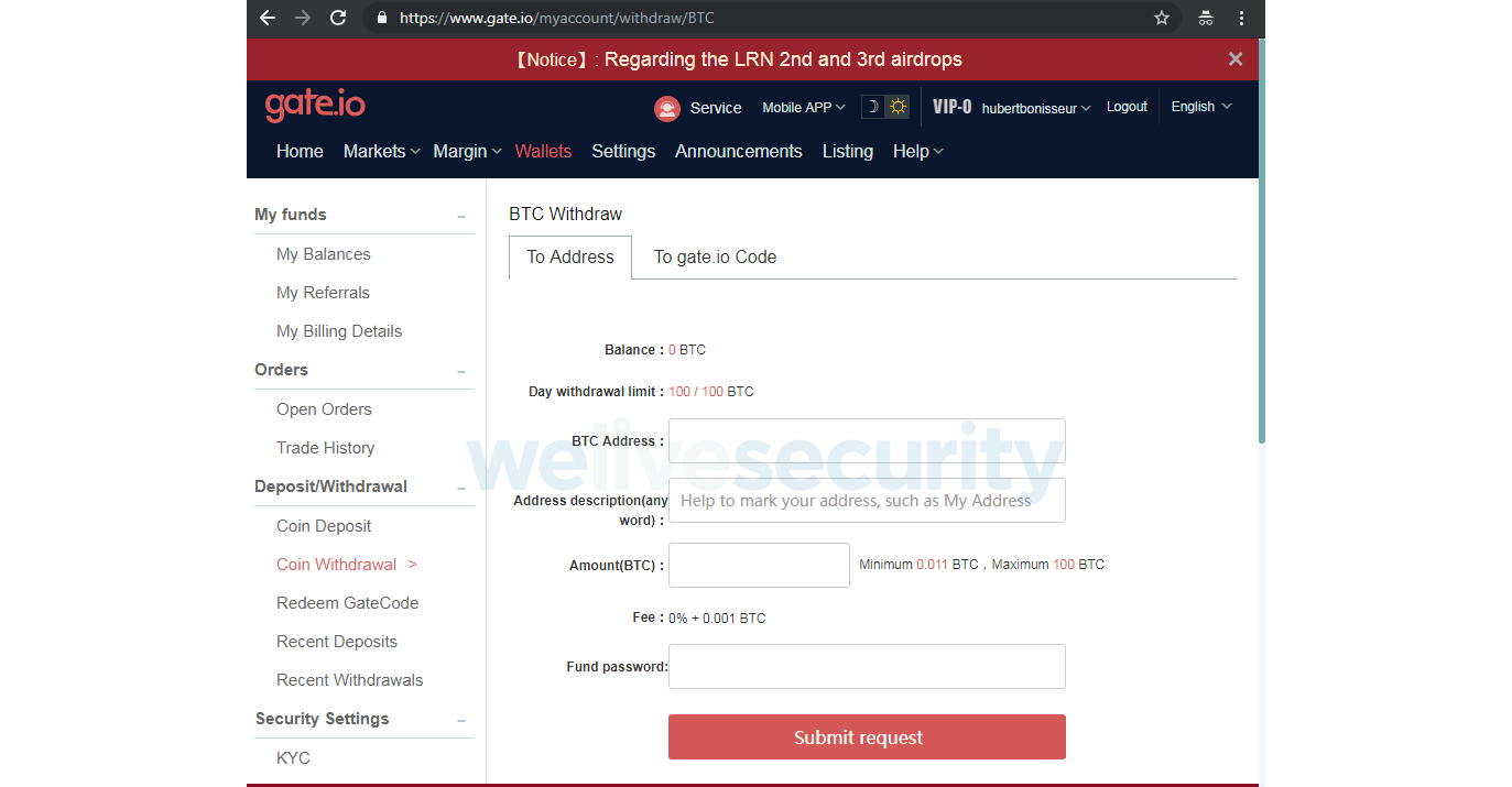 https://www.gate[.]io/myaccount/withdraw/BTC所对应的页面如下图所示,gate.io账户可以将比特币转移到外部比特币地址。