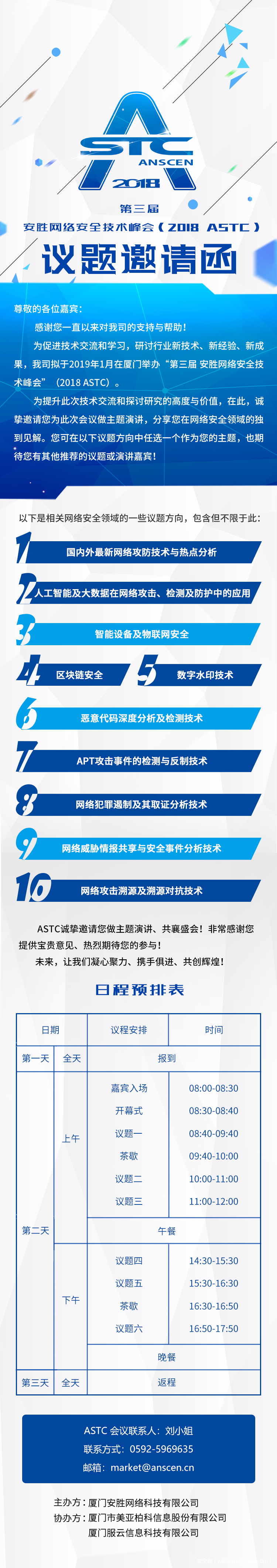 为促进技术交流和学习,研讨行业新技术、新经验、新成果,安胜科技拟于2019年1月在厦门举办“第三届 安胜网络安全技术峰会”(2018 ASTC)。