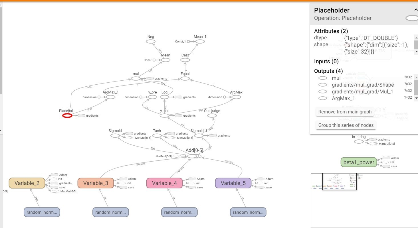 点进各个节点可以看到每个节点的输入(Inputs),输出(Outputs)和操作(Operation)。于是我们找到了In_string和Out_judge。跟着Out_judge的操作沿着输入一步一步往前走,能找到In_string。这些个过程就是黑盒的过程了。注意其中有很多的分支是没用到的,不必理会。最终整理出正向的操作(用tensorflow的函数表示):