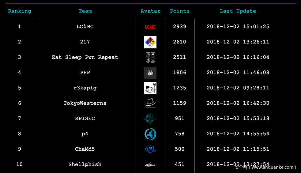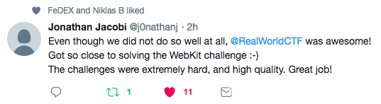 主办方长亭科技全球首创基于真实世界软件的全新CTF赛制,受到参赛选手们的喜爱和赞赏。据悉,该赛制创新性地结合了CTF夺旗赛和Pwn赛的优势,所有赛题全部基于真实世界软件的修改或二次开发来命题。不仅延续了传统CTF赛事中命题灵活、难度可控的特点,同时也能让参赛者在解题过程中挑战和体验Pwn赛中才会有的攻防技术。来自Eat Sleep Pwn Repeat的参赛选手在赛后表示:Real World CTF很酷,是他们2018年最喜爱的比赛。“即便我们没有发挥好,但Real World CTF真的很棒!我们已经距离解出WebKit这道题目很近了。比赛题目确实很难,质量也很高。大赛举办者做的很好!”来自Perfect Blue的参赛选手评价道。