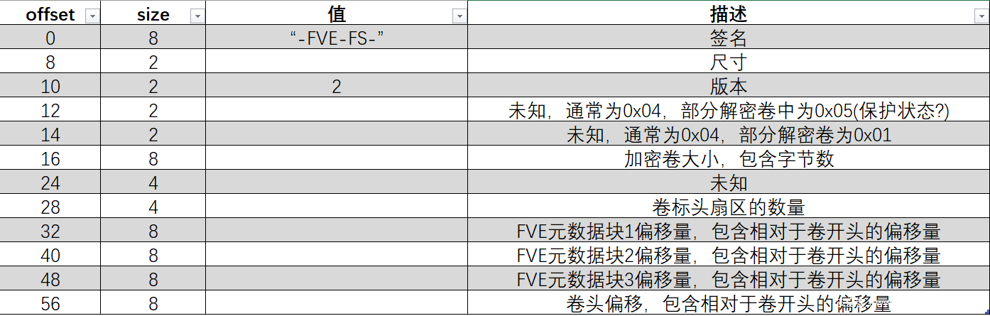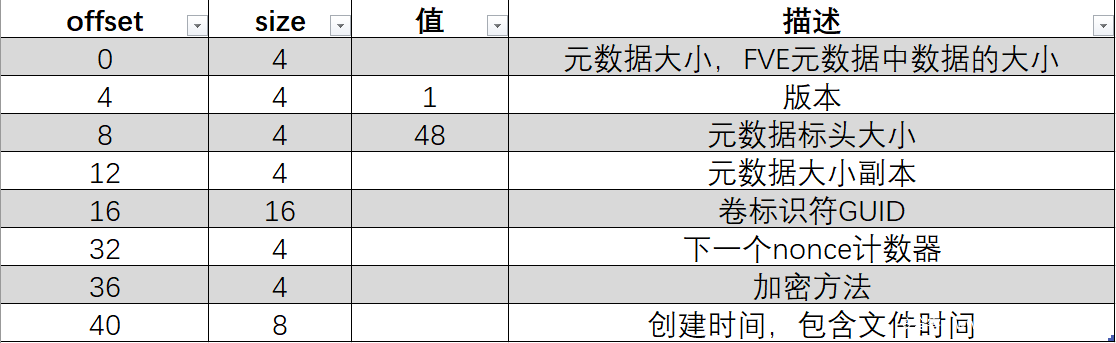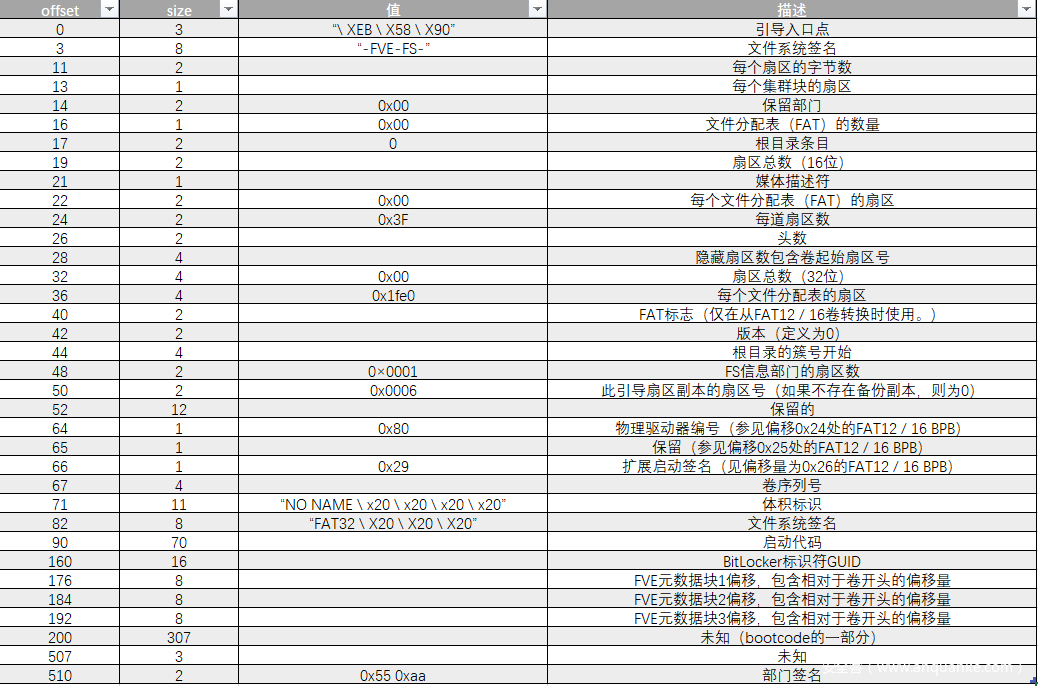 BitLocker卷包含3个FVE元数据块。每个FVE元数据块包括: