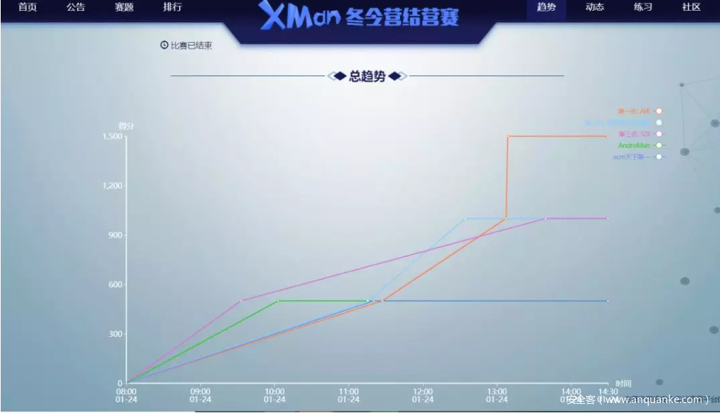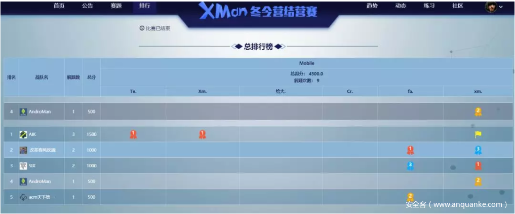 此次XMan冬令营的最终考核是一场由学员自主出题的CTF解题赛。在培养学员移动安全方面的理论知识与实战能力的同时,提高了学员的出题能力。结营赛的最后成绩由解题分+出题分组成,冠军AIK战队获得1891分、亚军改革春风吹满地获得1409分、AndroMan以909分摘得季军。