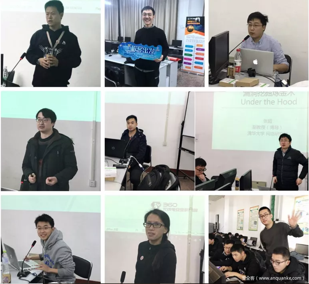 【从左至右:华为终端公司软件工程部架构师王安宇、梆梆安全安全研究员江嘉航、百度安全实验室安全研究员小灰灰、中国科学院信息工程研究所工程师,中国科学院大学网络空间安全学院授课讲师赵双、安天科技安全研究员高坤、清华大学副教授张超、腾讯玄武实验室安全研究员,蓝莲花战队队员刘惠明、360 UnicornTeam资深安全专家黄琳、FlappyPig战队主力队员路老师。】