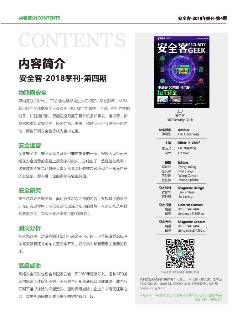 2017年年初,安全客的第一版电子年刊正式出版,一经发布立刻在安全圈内掀起一番读书热潮。今天安全客2018年最后一季度季刊正式和大家见面,截至本次已经发布了9版,并且在上一季度中,安全客季刊已经创下累积560000+的下载量,这是安全客一直坚守质量为本、干货为首的成果凝集,也是安全客用户和白帽伙伴对季刊品质的认可。我们在此次季刊中,也将秉承严格把控质量的原则,为大家呈现最优质、最热门的技术内容分享。此次季刊收录了来自12个安全平台的二十三篇优秀技术文章,涵盖公众讨论最火热的物联网安全、安全运营、安全研究、高级威胁、漏洞分析等五大季度热点方向,是网络安全从业者和爱好者不容错过的技术刊物!