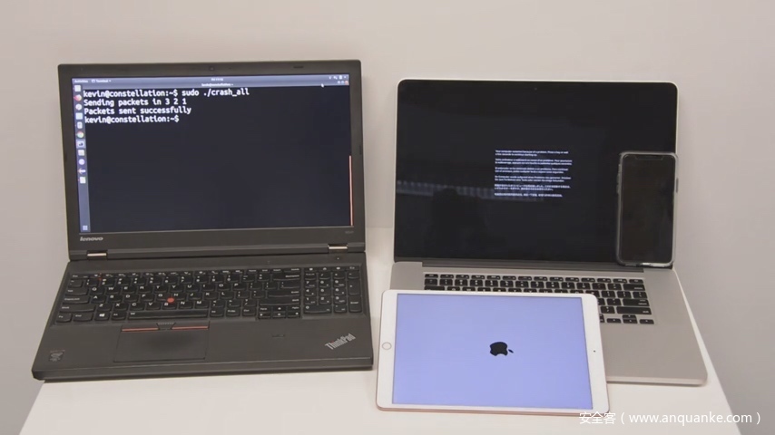 Kevin在推特中给出了PoC和演示视频,利用该漏洞可以使得同一局域网下的Macbook和iPhone设备崩溃。