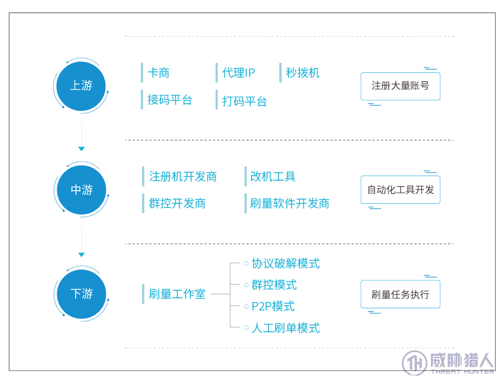 对于会员模式刷量产业链,整个产业链条可以分为下图所示的上中下游三大模块: