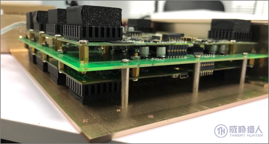 现在不少黑灰产工作室正在使用一种新型群控,我们称之为箱式群控。箱式群控是传统群控的升级变种,相较于传统群控,箱式群控不再需要外接的手机设备,而是直接将多个手机芯片封装在一个机箱中,通过网络将手机屏幕显示在控制电脑上安装的客户端内,削减了手机电池、屏幕等硬件成本,节约了占地空间,箱式群控大小仅为普通台式电脑机箱的四分之一。下图为箱式群控的内部结构: