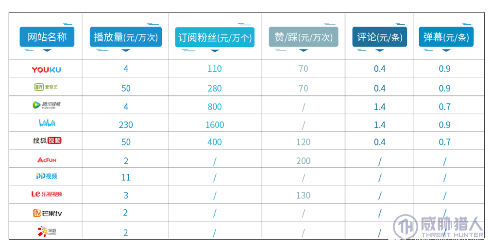刷量价格与平台大小和平台风控规则相关,我们综合不同刷量团伙的报价,统计出各大视频平台的刷量平均价格,如下所示: