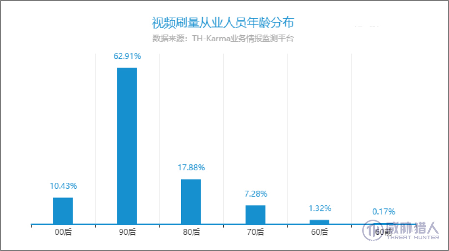 从年龄分布来看,刷量从业人员主要集中在90后,占据从业人员比例超过60%。90后不仅作为当代消费的主力军,同样成为当代黑灰产业的主力军。作为较早一批接触互联网的80后,在黑灰产中也占据了将近20%的比例。详情如下图所示: