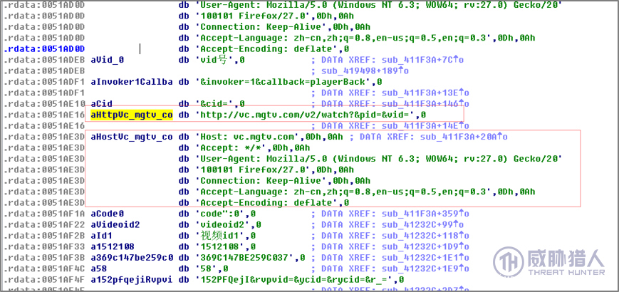 以2018年4月我们捕获到的一款名为“天龙刷视频软件”的最新版工具为例,支持包括优酷、腾讯视频、爱奇艺、芒果TV、乐视视频等多个视频平台的刷量,如下图,软件内部针对芒果TV构造的URL和HTTP请求头:
