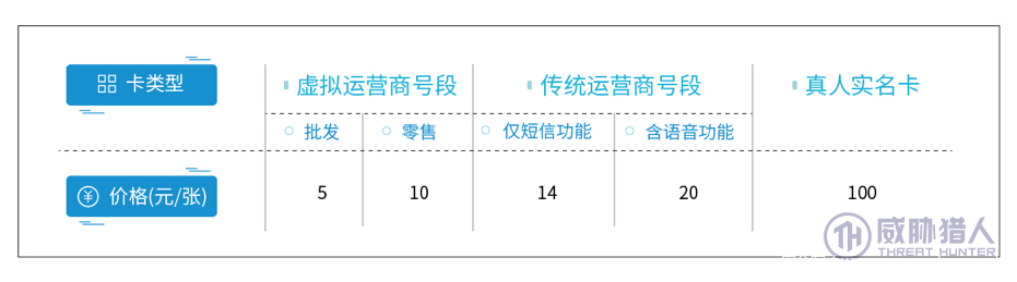 - 卡商:多以正常业务为幌子,通过各种渠道从运营商或代理商处获取手机卡资源,然后加价出售给下游卡商、接码平台、下游号商赚取差价。其提供的手机卡按类型可分为:虚拟卡/实卡、语音卡/短信卡、海外卡/国内卡、流量卡/注册卡。