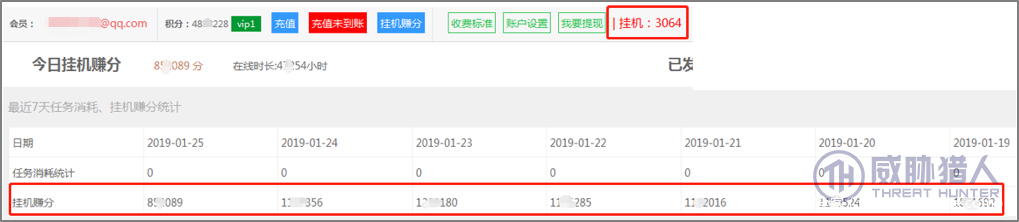 - 挂机用户挂机赚分:某款挂机软件界面如下,下载并登录挂机软件后,选择赚分模式并点击开始赚分,即可自动开始获取任务并自动执行任务,任务执行成功后会获得相应的积分: