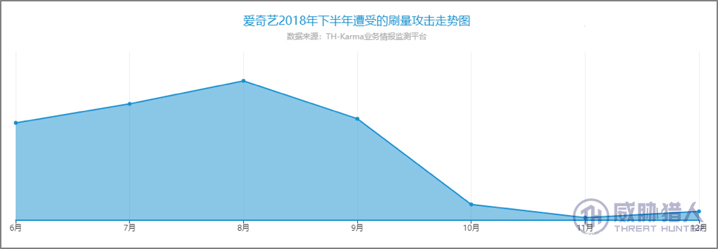 可喜的是,已经有在线视频平台率先并持续性与视频刷量黑灰产进行着积极地对抗,并且效果显著。下图为爱奇艺2018年下半年遭受的视频刷量攻击走势图,随着该平台在2018年9月份上线包括关闭前台播放量展示的新策略,刷量攻击曾一度出现断崖式下跌: