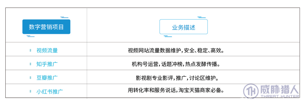 与电信诈骗、非法贩卖公民信息等具有明确违法犯罪的性质不同的是,刷量一直游走在法律的灰色边缘地带。部分从事广告推广、市场营销、公关活动等正常业务的工作室,也会承接刷量业务,并且刷量业务被包装为所谓的视频数据维护业务,并且工作室有正规的注册信息和网站,部分工作室还能提供合同与正规发票。例如,下图为某视频刷量工作室官网展示的业务范围及介绍: