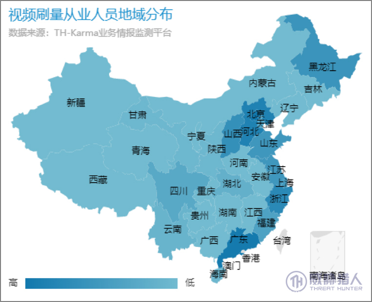 下图展示了刷量从业人员的地域分布情况。可以发现,刷量从业人员集中于我国的东部地区,其中北京、广东、河北、浙江、山西占据了地域分布榜单前五名,基本符合经济发展水平和人口密集度分布。由此可见,越是经济发达的地区,互联网犯罪越是多发,相对而言经济欠发达的地区,利用互联网犯罪还未形成规模。详情如下图所示: