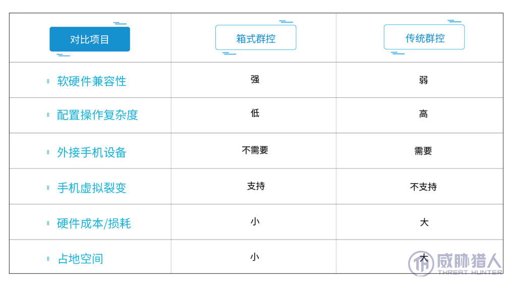 箱式群控软硬件成套销售,箱式群控软件在稳定性、软硬件兼容性、功能完善性等方面都要明显优于传统群控软件。通过虚拟分割手机芯片内存可实现多开,每个手机芯片可裂变为十部“手机”,可以为每个“多开手机”伪造不同的设备信息,如IMEI、手机定位、本机号码、网络信息等。也可通过电脑客户端操作批量安装App、设置代理IP、修改手机设备信息。箱式群控和传统群控优缺点对比如下: