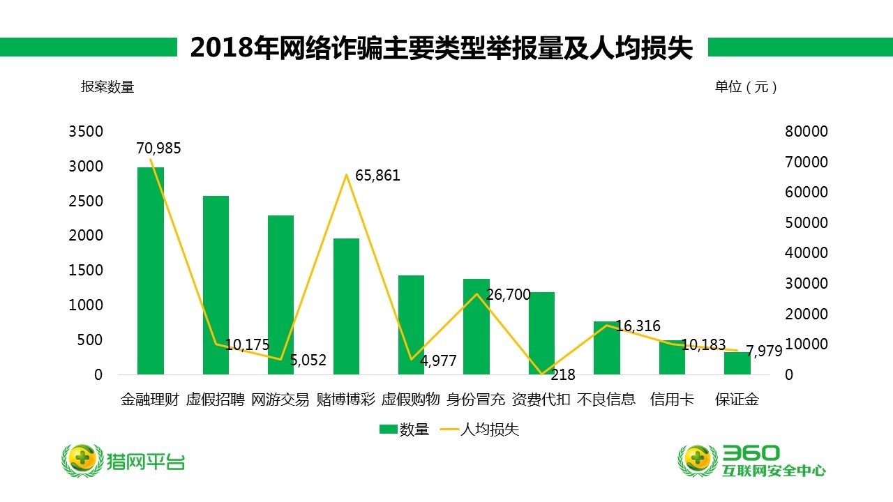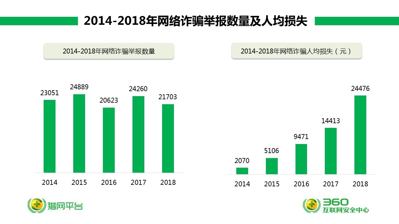 2018年,猎网平台共收到有效诈骗举报21703例,举报者被骗总金额超过3.9亿元,人均损失24476元,创近五年新高,较2017年人均损失增幅69.8%。