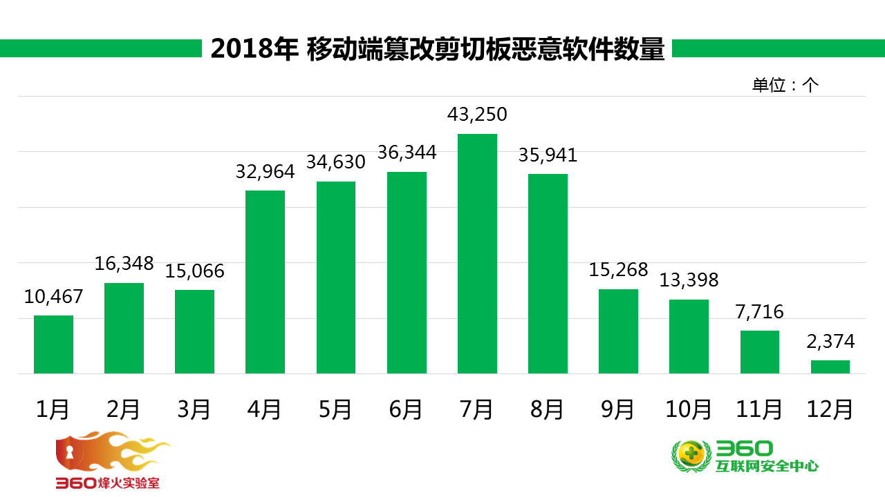 图2.4 2018年移动端篡改剪切板恶意软件每月新增数量