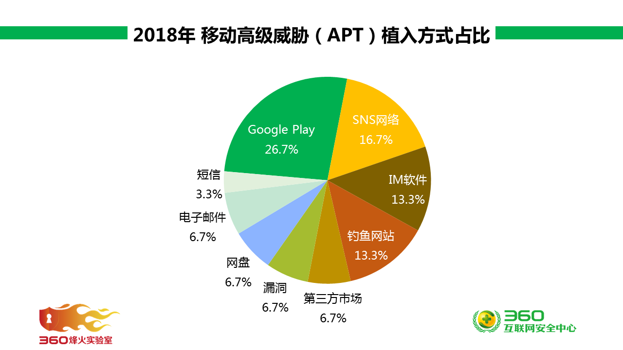 - 2018年移动高级威胁方面,360烽火实验室监测到的公开披露的APT报告中,涉及移动相关的APT报告23篇。被提及次数最多的被攻击国家依次是韩国、以色列、巴基斯坦、巴勒斯坦、伊朗、叙利亚和印度。